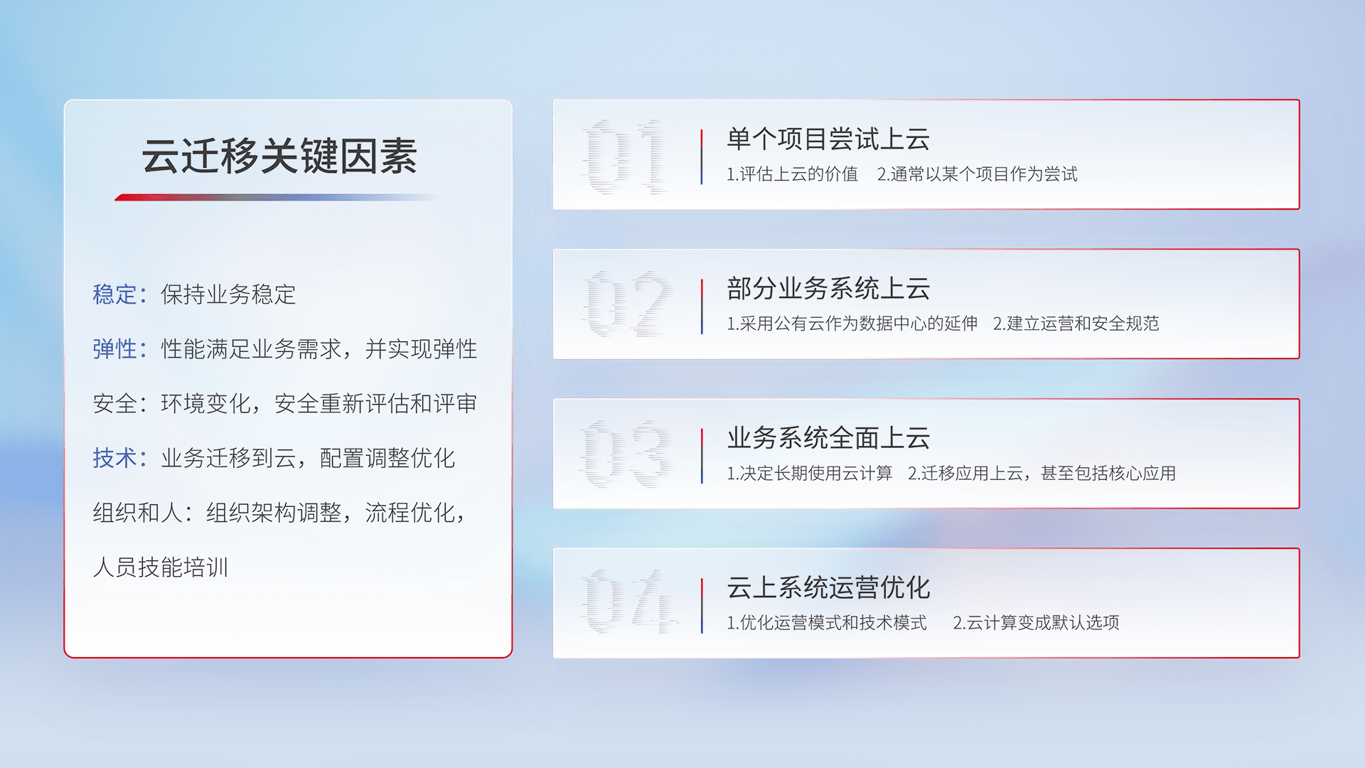 结合实际业务,,,,从规划设计、、、、云平台选型、、云原生改造、、数据迁移、、、集成交付,,,迁移全过程为客户识别最佳上云路径,,做好风险识别管理,,设计网络架构、、、、身份权限、、、、安全审计合规、、、、操作审计、、、日志审计、、监控告警策略、、多站点容灾设计等,,,对云上基础设施进行整体规划,,,提升IT治理水平,,,以满足弹性、、高可用、、高性能的需求。。。